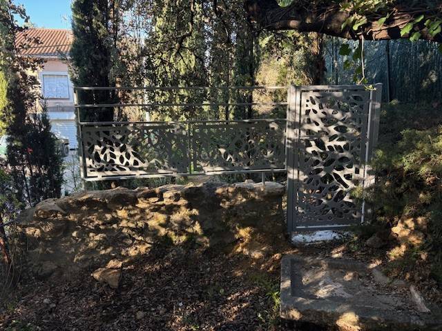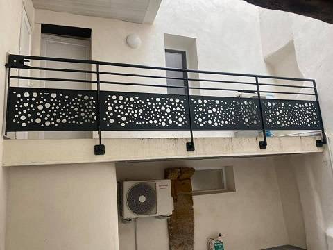La société Aubipose, ferronnerie située à Aubignan dans le Vaucluse, vous propose la fabrication sur mesure (avec ou sans pose) d'un garde corps de terrasse barreaudé en partie haute et avec insertion d'un décor découpé au plasma représentant des bulles.